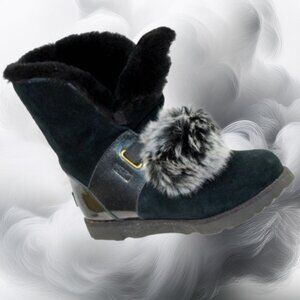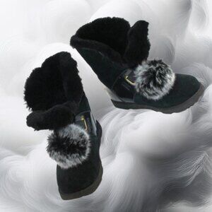 UGG Isley Shearling Lined Pom-Pom Black Shimmer Slip-On Tall Ankle Boot,…