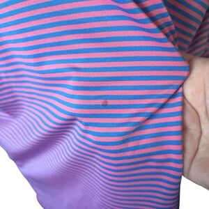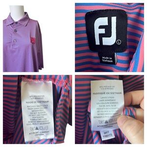 Lot of four golf polos: 1 pink and white striped from F&G Tech, 1 pink and blue striped from Footjoy, 1 solid green from Peter Millar and 1 blue geometric print from Peter Millar. All for have carious golf/country club logos on the chest. All are a polyester, spandex blend. Lightweight and comfortable. All are a size alrge.