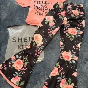 Adorable 2-piece Shein Kids outfit featuring a coral pink “Little Miss Sassy Pants” graphic tee and floral bell-bottom pants with ruffle trim. Size 120 (fits US 6–7). Perfect for your little fashionista who loves to show off her sass and style!