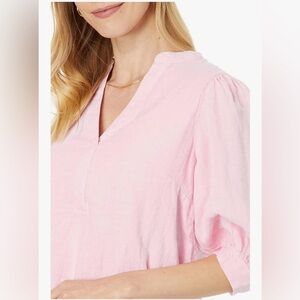 Easy fit, popover dress with a stand collar, half placket, and elbow-length puff sleeves.