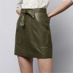 Elegant real olive leather mini skirt. Features a stylish tie waist and sleek design. Originally $795