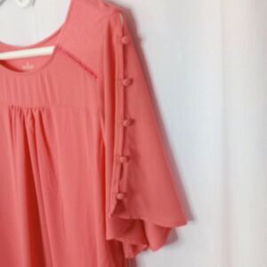 rayon /spandex knit. soft flowy. functional covered button detail on sleeves. loose fit. lightweight