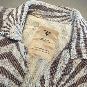 OAS shirt with bold geometric sun design. Features brown and white colors. Made from soft terry cloth.