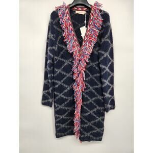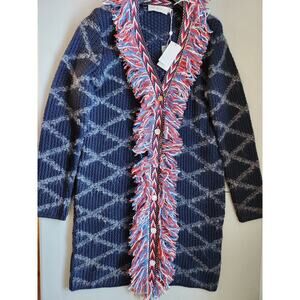 NWT Tory Burch Tweed Trim Long Cardigan Size S Navy Fringe Knit $898 #2K501