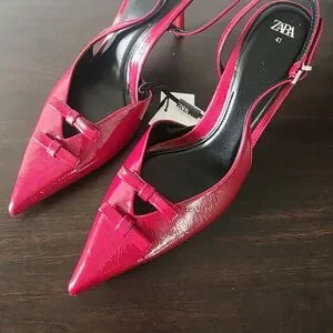 These Zara heels feature a vibrant red color and a sleek slingback design, complete with a pointed toe and a medium-height stiletto heel. Crafted from smooth leather, they offer a glossy finish and an adjustable strap for a secure fit, making them ideal for formal occasions.