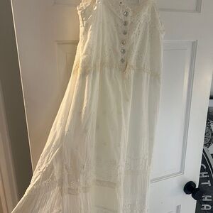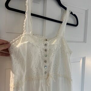 Charming white maxi dress with delicate lace details. Sleeveless design with button accents. Perfect for warm days.