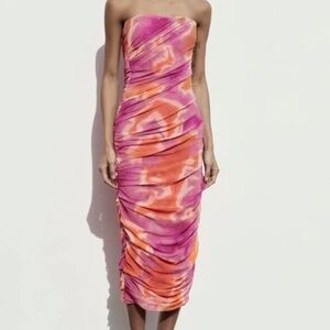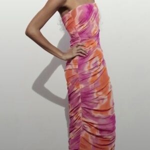 tags: zara viral dress pink orange strapless midi swirl mesh ruched tulle bodycon sunset tones event vacation throwback it dress og sold out rare fashion resale