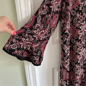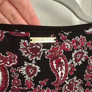 This Michael Kors dress features a striking black and pink floral pattern, perfect for casual or work settings. The A-line silhouette offers a flattering fit, while the 3/4 bell sleeves and crew neck add a touch of elegance. Crafted with attention to detail, this dress combines style and comfort effortlessly.
