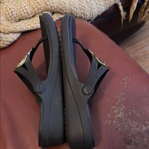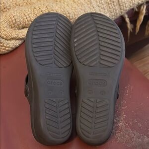 Stylish CROCS sandals in black with eye-catching gold accents. Perfect for casual wear.