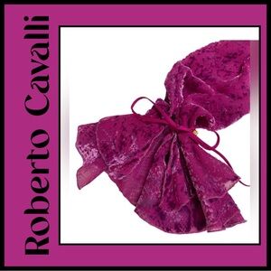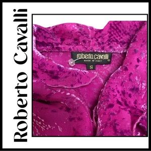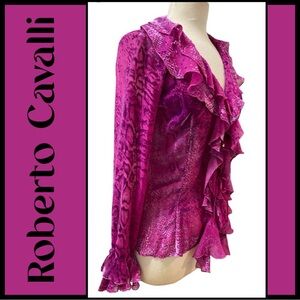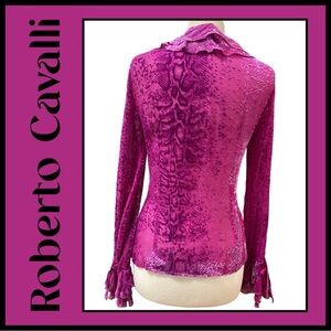 Rare ROBERTO CAVALLI Italy beautiful Magenta, lightweight sheer drapey, Silk/Rayon Cut Velvet, Animal print, fitted Blouse. 3 tie, double Ruffle V-neck front and ruffle sleeve with signature ties. Size Small. Blouse Measurements - 36โ