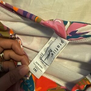 Vibrant floral high-waisted bikini bottom with pink, orange, and green hues. Perfect for a tropical getaway.