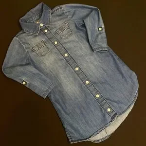 Old Navy Girls 4T/4/preschool navy blue cotton denim shirt dress. Lightwight, flowy, soft, comfy. Long sleeves. Cute chest pockets detail (sewn shut, for design/style only.) Button-up front closure. Collar. Cute split-side seams. Rounded hem. Roll-tab sleeves so it can be worn as a 3/4 sleeve as well as long sleeved look. Could be worn with your own belt for another look.