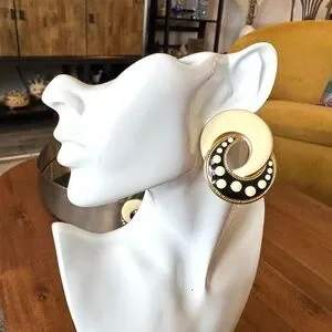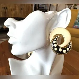 Wow—these vintage earrings are absolutely stunning and full of personality. Crafted from lightweight metal with enamel detailing, they feature a bold and artistic interlocking circle design that looks almost handcrafted. The off-white semicircle on top is beautifully balanced by a black enamel circle on the bottom, detailed with off-white polka dots for a playful, eye-catching finish. Post backings make them easy to wear, and despite their statement size (2 inches long by 1.5 inches wide), they're wonderfully lightweight. Minimal signs of wear, but all the vintage charm. These earrings are a perfect blend of mod, eclectic, and preppy—ready to add instant pizazz to any outfit.