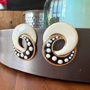 Keywords: vintage statement earrings, enamel earrings, polka dot earrings, interlocking circles, mod earrings, retro chic, 80s earrings, black and cream, artisan style, lightweight earrings, preppy vintage, sculptural jewelry, eclectic accessories, retro glam, post back earrings, bold earrings