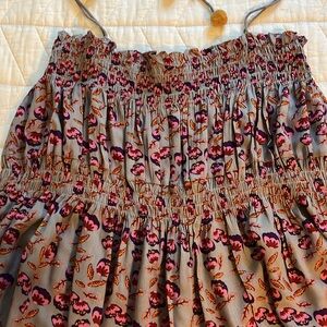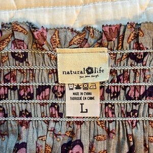 Natural Life grey and pink floral camisole size large. This top has elastic smocking around the top, on the sides and around the back. It has shoulder ties with Pom poms. The lightweight fabric make it ideal for warm weather, while the partial gathered waistline offers a flattering fit.