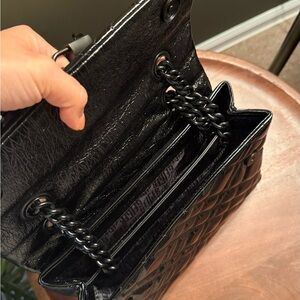 This elegant shoulder bag features a classic quilted design in high-quality black leather, complemented by a sleek chain strap. Its structured silhouette and glossy finish exude sophistication, making it a timeless accessory for any occasion.