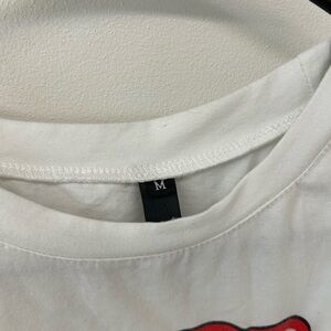 Stylish short sleeve tee. Features bold graphic with red lips and hand gesture. Comfortable and trendy.