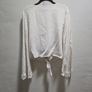 White silk top with shell buttons, large bell sleeves, and tie front. Sleeves with lace hem. Size 2 is approximately a M/L.