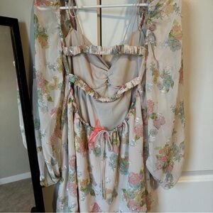 Charming dress with pink floral design. Features delicate chiffon fabric and stylish puff sleeves.