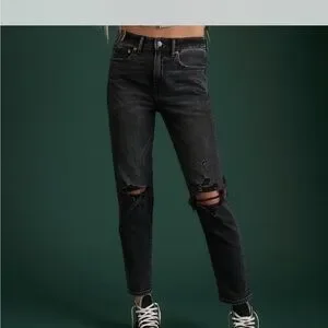American Eagle faded black, ripped, mom jeans from their ae77 premium line. Nice, mostly cotton jeans, these are ankle length and size 6 short