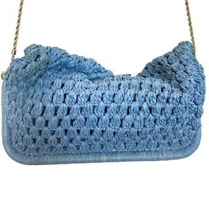 A textured blue rafia with a chic gold chain, perfect for adding a pop of color to any outfit