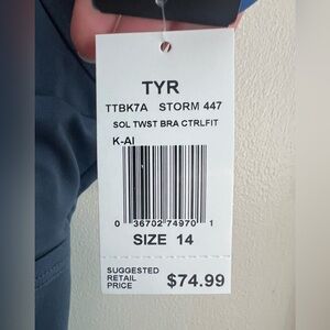 Brand new with tags TYR women’s size 14 TYR Durafast Elite® Women's Twisted Bra Swimsuit. Measurements for a bathing suit are in the last photo. Suit is new with tags and has the sanitation guard still intact. Adjustable straps and a pretty blue color.