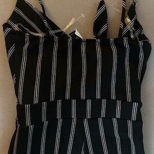 Elevate your style with the Windsor Black and White Wide Leg Jumpsuit, featuring a striking vertical stripe pattern. This sleeveless design with thin straps offers a relaxed and flowing silhouette, perfect for both casual and sophisticated occasions. Crafted from lightweight fabric, it ensures comfort and elegance throughout the day.