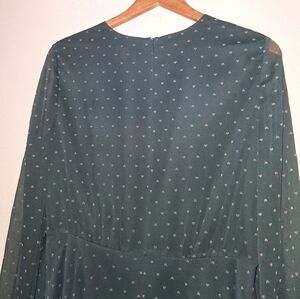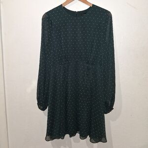 This Ted Baker dress is a stunning choice for wedding guests or a night out, featuring a pleated design in green with gray hearts. The long sheer sleeves and crew neck add a touch of elegance, while the lightweight fabric ensures comfort and style.
