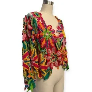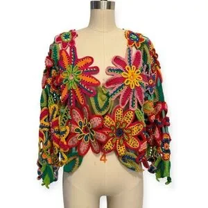 RARE Vintage MICHAEL SIMON Vibrant Multicolor Floral Crochet Beaded Cardigan.