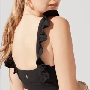 It’s a sports bra straight out of a romance novel. This bra features the most romantic, ruffled shoulder straps, a daring square neckline, and a flirty low back.