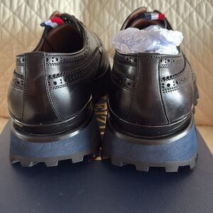 These black leather Oxford shoes feature a classic brogue design with intricate perforations, offering a sophisticated touch to any formal attire. The polished leather upper and traditional lace-up closure ensure a timeless and elegant appearance. Perfect for business or formal occasions, these shoes combine style and versatility.