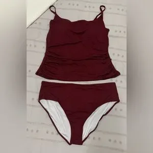 Stylish burgundy tankini swimsuit. Features a sleek design with a high-waisted bottom.