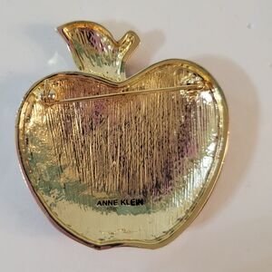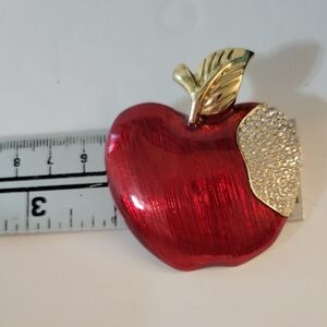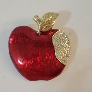red enameled apple in goldtone metal and clear Rhinestones. measures approx 2.5" x 2". Great used condition.