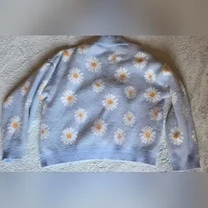 Stay cozy and stylish with this charming blue cardigan sweater with floral pattern. Perfect for adding a touch of elegance to any outfit.