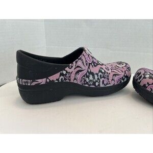 The Crocs Women's Duel Comfort At Work Neria Pro II Graphic Slip Resistant Clog in size 8W is a casual shoe designed for comfort and safety. Featuring a low heel height and slip-resistant outsole, this clog is perfect for working in various industries where safety is a top priority. The multicolor design with paisley accents adds a stylish touch to this practical and durable shoe from the trusted brand Crocs. With its slip-on closure and synthetic lining, this clog offers both style and functionality for women on the go.