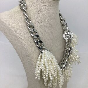 Turn heads with this bold and luxurious Banana Republic statement necklace, featuring an eye-catching design that merges glamour with edge. This stunning piece showcases a chunky silvertone curb chain, richly adorned with dramatic fringe clusters of faux ivory pearls. Each tassel is composed of cascading strands of lustrous beads, adding dynamic movement and striking texture to the piece.