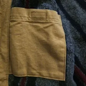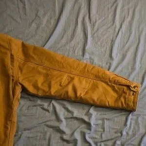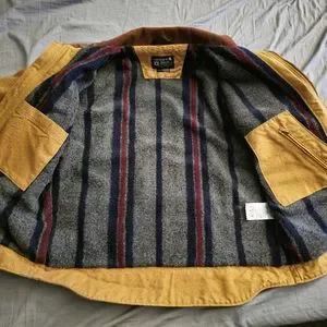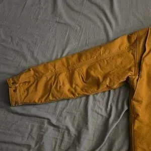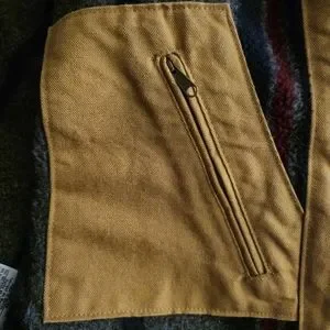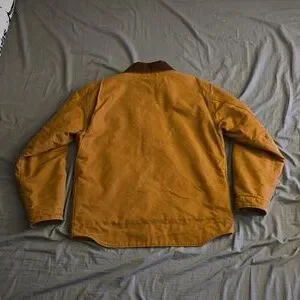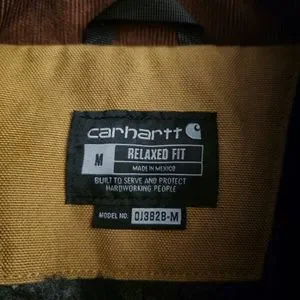 Durable Carhartt jacket. Features a dark brown collar. Front zipper and pockets for utility.