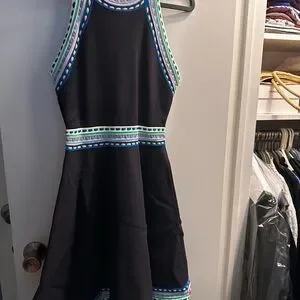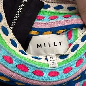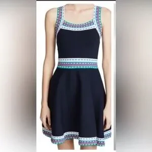 Elegant Milly midi dress in navy. Features vibrant trim in blue, green, and pink. Perfect for any occasion.