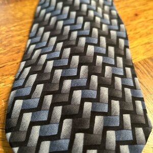 Stylish tie with a bold zigzag pattern. Features black and blue tones. Perfect for adding flair to any outfit.