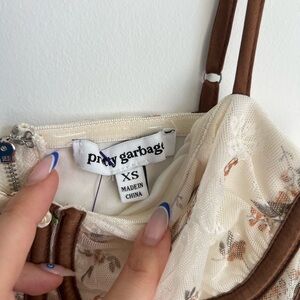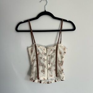 This chic crop top features a beautiful cream base with elegant brown floral patterns. Perfect for adding a touch of sophistication to your wardrobe.
