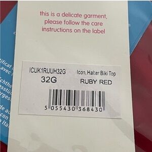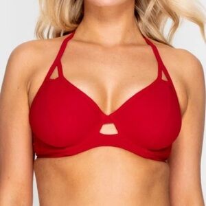A bright ruby red Miss Mandalay bikini top in the Icon halter style. Clasp closure at the back and tie halter straps at the neck. This is a UK size 32G, which translates to US size 32I (see size chart). It is New With Tags attached!