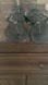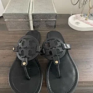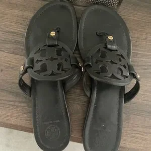 Stylish black sandals with a distinctive logo design. Perfect for casual wear. Some signs of use.