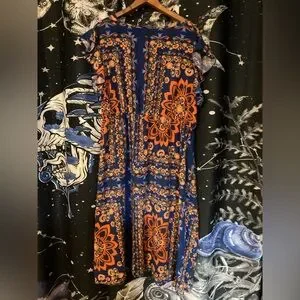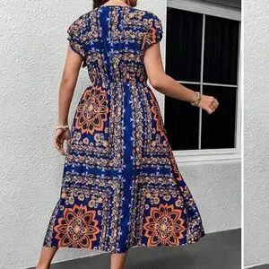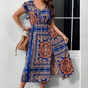 This Blue Orange Tiered Midi Dress is perfect for casual and resort wear. This sleeveless dress features a flattering A-line silhouette with a crew neck and flutter sleeves, offering a chic and comfortable style. Split Hem. The vibrant blue and orange colors add a lively touch, making it a standout piece for any relaxed occasion.