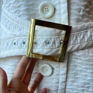 NWOT. Size large. 100% cotton shell. Bright white color with gold belt hardware.