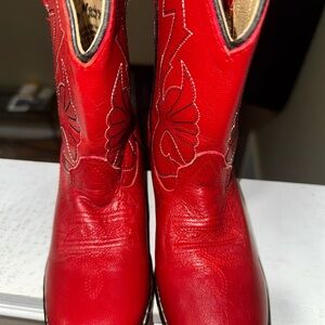 These striking red cowboy boots feature a classic Western design with intricate decorative stitching on the shaft. Made from high-quality leather, they boast a pointed toe and a contrasting black heel and sole, making them a standout addition to any wardrobe.