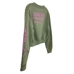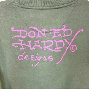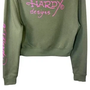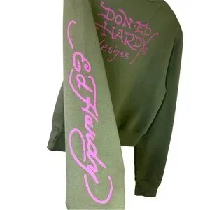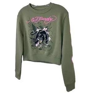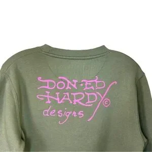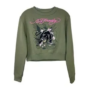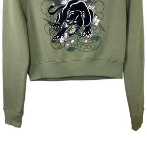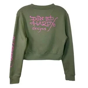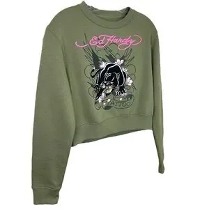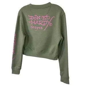 Ed Hardy - Women’s Y2k Graphic-Print Sweatshirt, Cropped, ‘Tattoo’ - Green Small