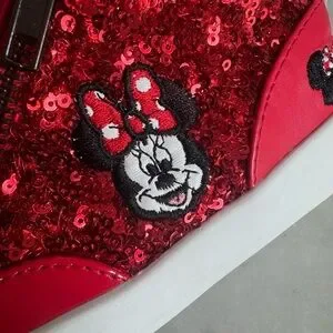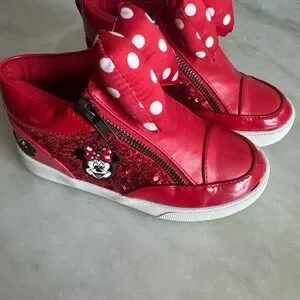Red sneakers with Minnie Mouse design. Features polka dot bow and side zipper. NWOT will be listing a matching jacket sold separately