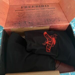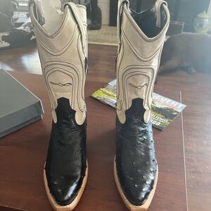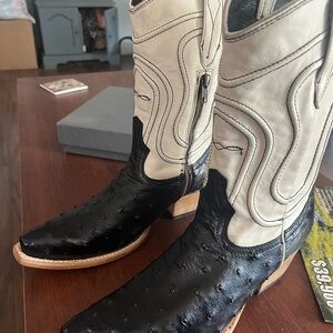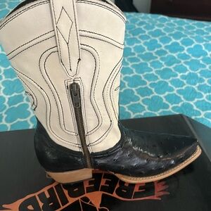 Stylish heeled boots by Freebird. Black and cream leather design. Perfect for any occasion.