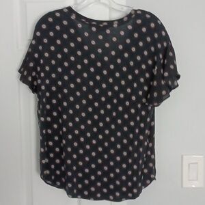 This LOFT blouse features a classic black and white polka dot pattern, offering a relaxed fit with short sleeves for a comfortable and stylish look. The lightweight fabric and flowing silhouette make it a versatile addition to any wardrobe. Good condition. Smoke free home.