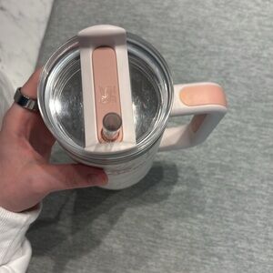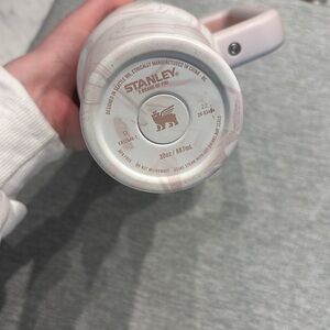 Elegant Stanley tumbler with a swirl pattern. Comes with a sturdy handle and straw.